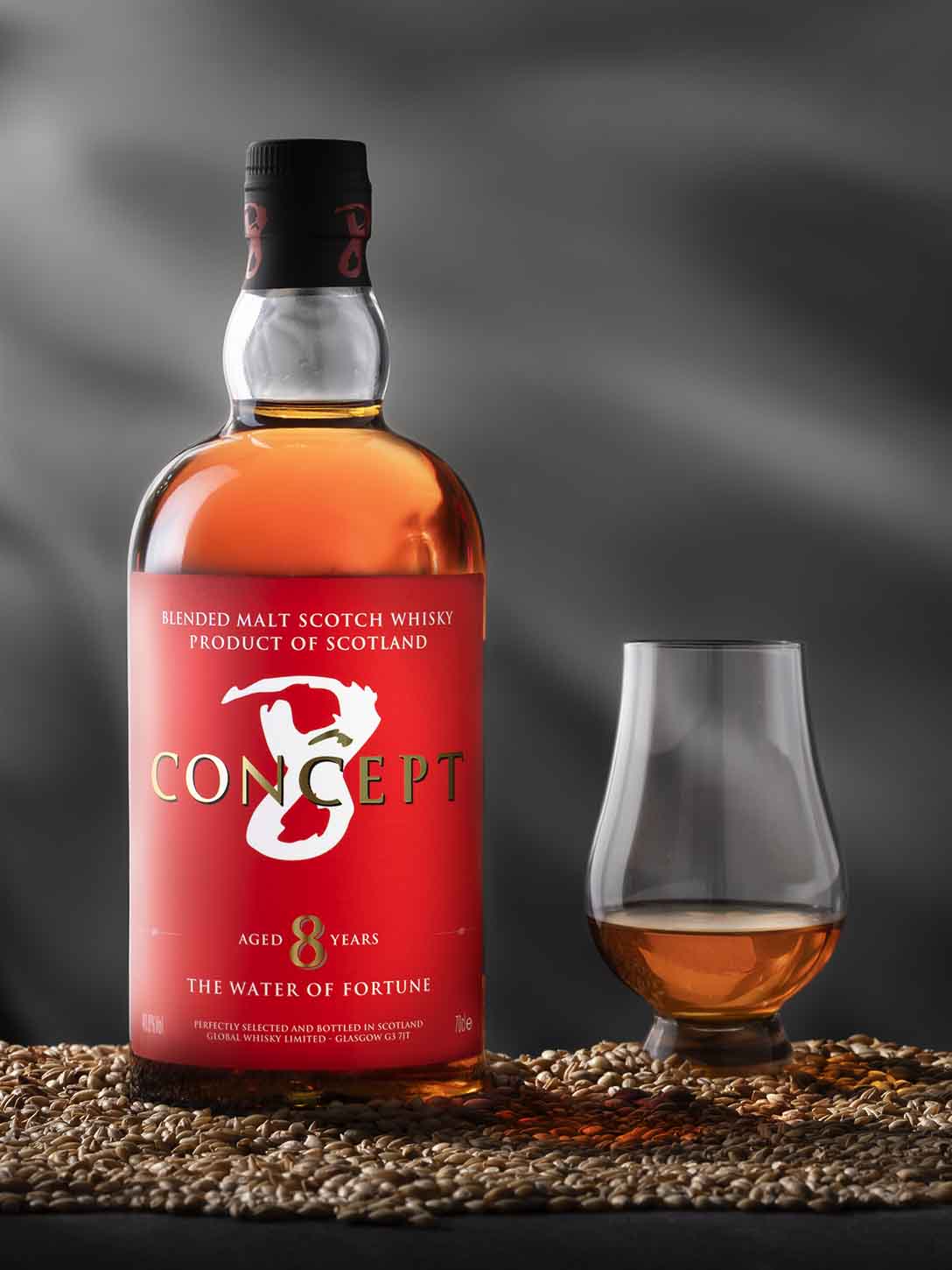 This release of Concept 8 is a blended malt taken from a series of Scotch whiskies selected from 3 main whisky regions in Scotland, Highland, Speyside & Islay. Each Malt has been matured for 8 years before the blending process begun, all are bottled at 40.8%abv
